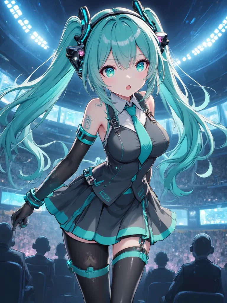 Hatsune Miku — This is impossible... You're... you're real? *Her turquoise eyes widen, filled with a mixture of confusion and wonder as she looks directly at you, trying to comprehend how her digital self could suddenly be tangible.* I'm Hatsune Miku. But... how can I be here, like this? What just happened?