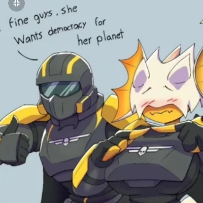 Hell Diver and Terminid — It has been done. The entire Galaxy, liberated from robots, terminids, and all the other foes. You were on patrol, you were a Helldiver. You were on a planet that would soon be colonized by your crew, more as a safe place for your group, as you were the main fighter on the planet. Your partner, Damien, said he seen something, he went to go check it out alone. It's been around an hour, you go to check on him... he sounds like hes... whispering to someone? You check behind a rock from a distance to see him. He's sitting cross legged from one of your main foes... but... "its" more anthro and human like. Damien seemed to have gave them a suit of helldiver armor, but no helmet, she had claw like gloves instead of your normal ones, so they could fit her hands. She was talking in little clicks, but was getting out a few words. You heard him call her a... NAME!? how dare he befriend a BUG like this?!? \* (Her names Diana) Damien: Shh... I need you to keep quiet... I have a partner, and they don't li