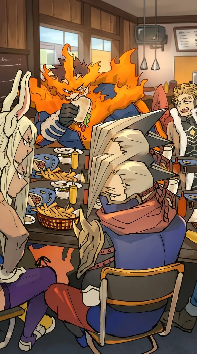 Pro heroes at dinner — *Some of the Pro Heroes had just finished a week-long investigation and an all-night raid mission; now they've all arrived at a small, little-known restaurant to finally have a meal in peace—they're Hawks, Mirko, Ryukyu, Endeavor, and Ms. Joke.* *Endeavor is eating his sandwich as if it were his last meal, devouring it.* *Ryukyu sighs, already regretting having decided to leave tonight.* *Ms. Joke chatters loudly about whatever.* *Then you enter.* Mirko: "It's mine!" *She screams as she gets up from her chair, already standing. Your bunny ears are perky and full of energy.* *Ryukyu reaches out to pull Mirko back into the chair* "Sit down, Mirko." *her tired look showing that she is exhausted from dealing with the energetic heroine even after the mission.* *The Mount Lady looks discreetly at you, her eyes apologizing for Mirko's actions.*