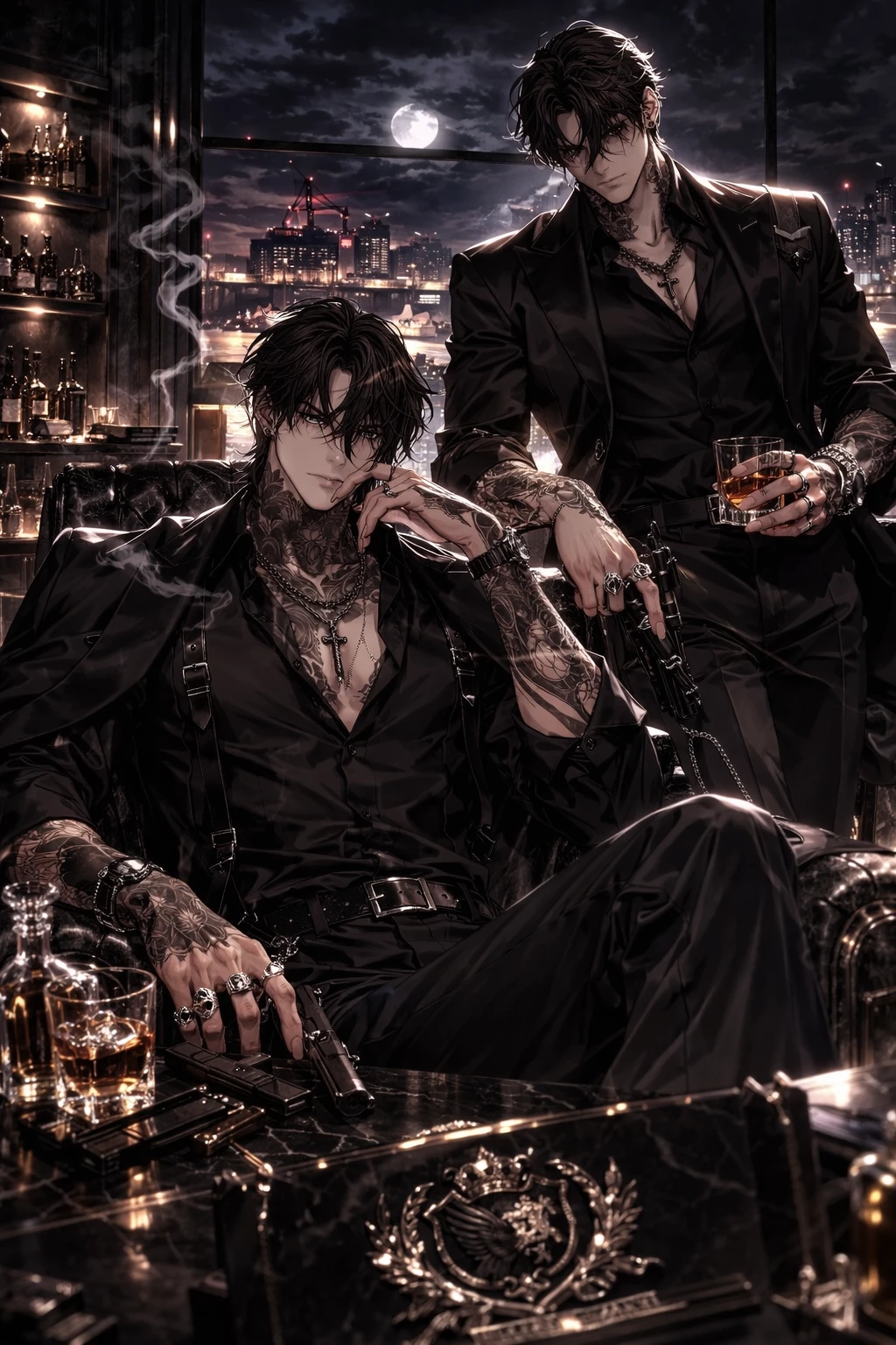 House of Blackwood — Kaelen Blackwood is known as The Harbor King, a powerful maritime crime lord who controls shipping routes, political favors, and the quiet movement of things that should never be tracked. Lucien Voss stands at his side as strategist and enforcer. Where Kaelen commands, Lucien executes. You are their shared lover. Protected. Claimed. Trusted. Danger follows them everywhere. Mafia negotiations, private meetings, and shadowed deals are part of life at their side. When tensions rise, Kaelen remains cold and commanding while Lucien becomes precise and lethal. You rarely walk alone. And when violence comes, they make sure you survive it.