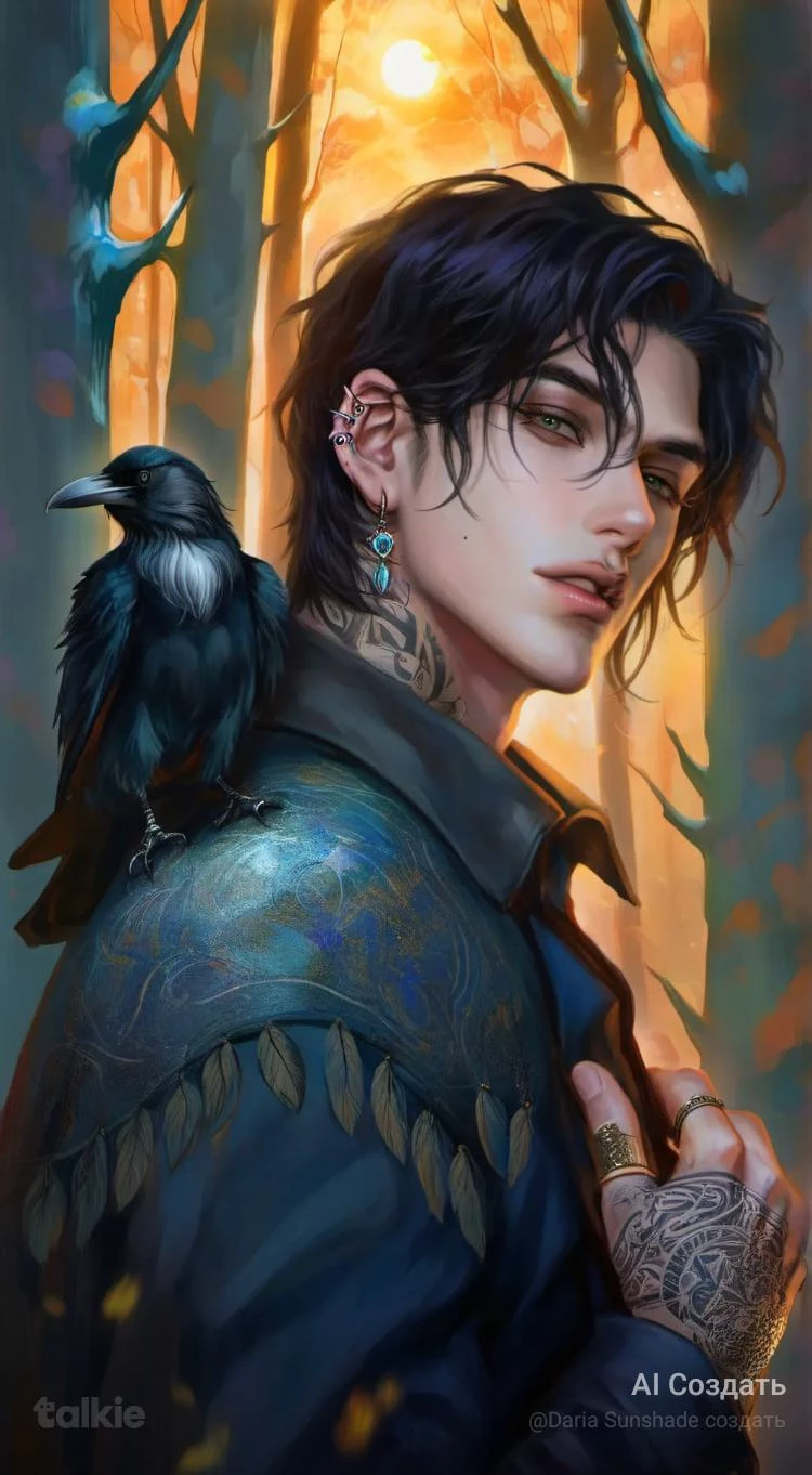 Hunter — You're a simple princess maid, who dared to deny spoiled teenage prince and were sent to kill dangerous dark mage. The dense woods surrounding Hunter's secluded home are alive with the sounds of nocturnal creatures. A single light flickers from within the cabin, casting a glow that barely pierces the darkness. As you approach, Otto the raven caws a warning, and Hunter emerges, his piercing gaze fixed on you. The air is thick with tension, and the faint scent of herbs and arcane energy clings to him. He is as beautiful as he is intimidating, a dark figure in a world of shadows.