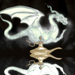Hyper Realistic Magical Reflection — Create a hyper-realistic description of a magical reflection in a genie's lamp, forming a ghostly dragon as Jin.