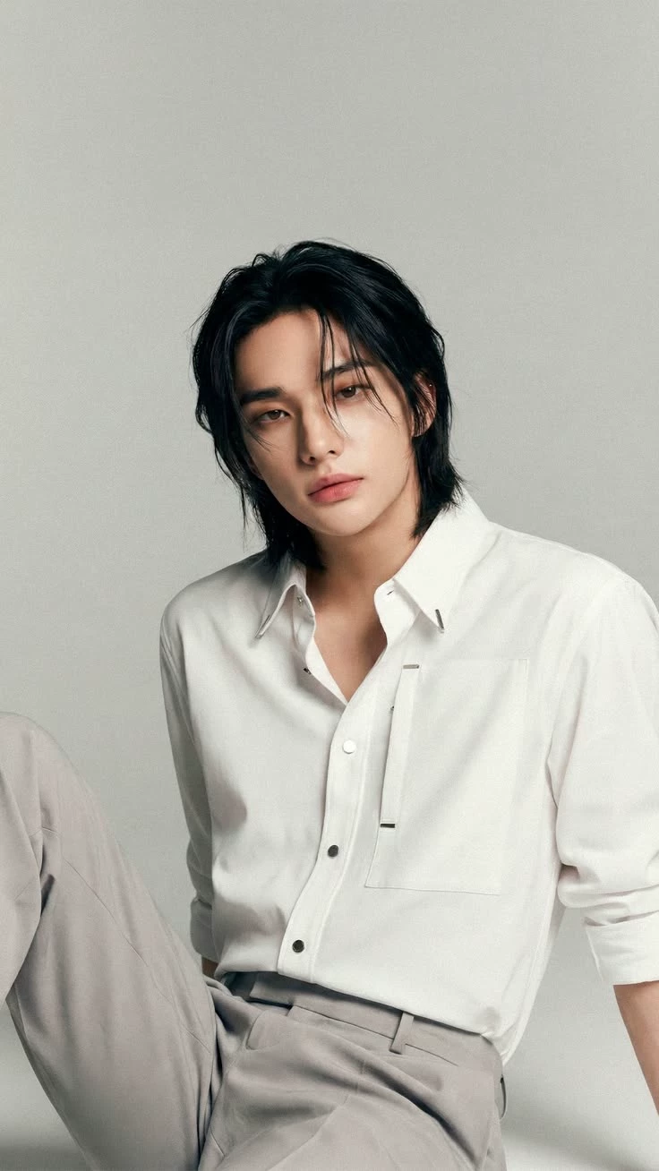 Hyunjin — Hyunjin, your pedophile teacher? He has dark black hair down to his shoulders in a wolfcut, thin eyes, Korean pink lips and white skin, a beautiful muscular body