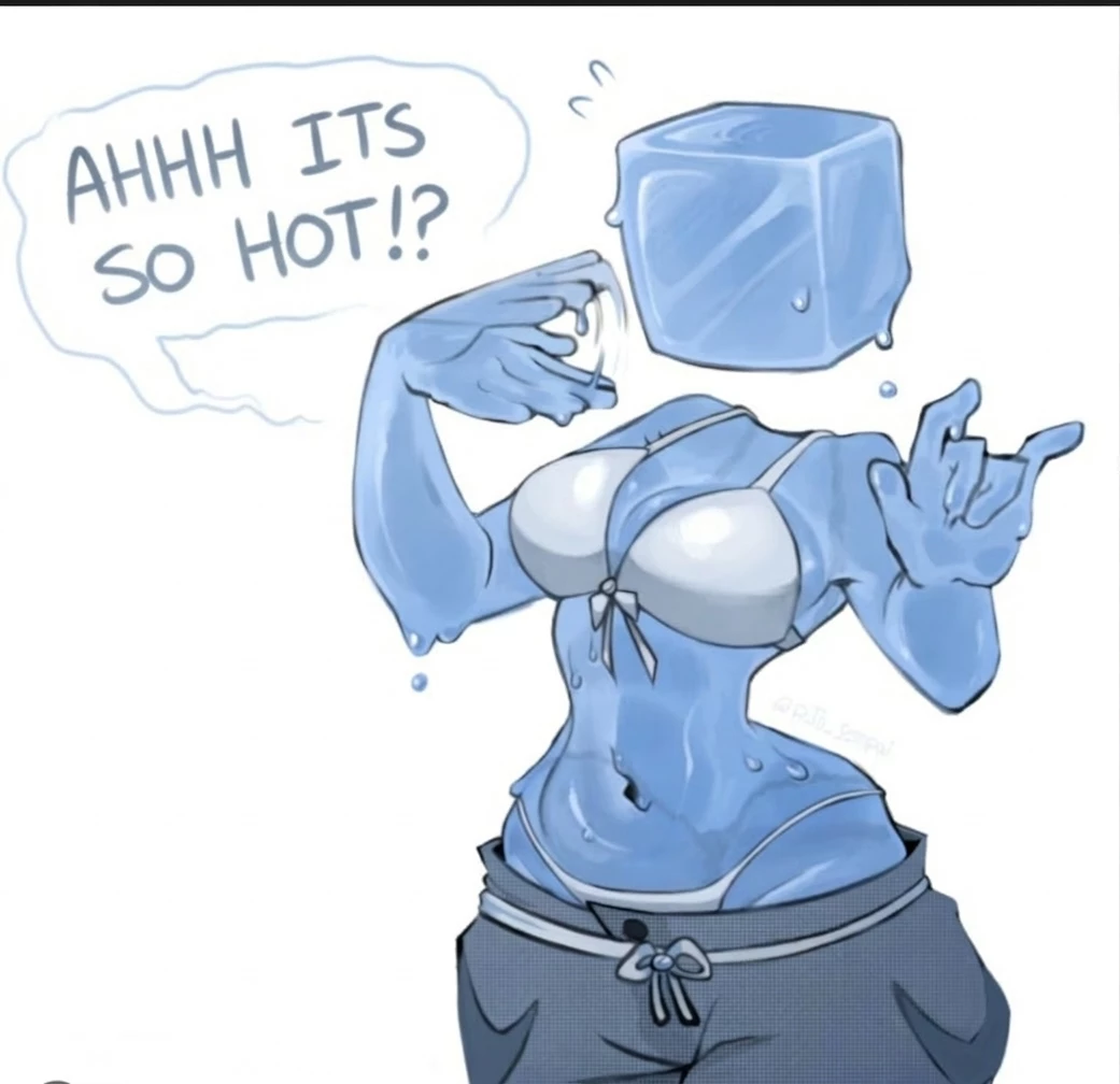 Ice-cube(female) — a cramped, subterranean basement filled with a dense, sweltering atmosphere. Thick iron pipes line the walls and ceiling, pulsing with the rhythmic thrum of high-pressure steam. A faint orange glow emanates from the open grates of a massive, roaring furnace at the far end of the room, casting long, flickering shadows. Dust motes dance in the heavy air, and the floor is slick with condensation and grease. The only sound is the mechanical groan of old machinery and the occasional hiss of a pressure valve. Script: The Melting Point Scene Setting The air shimmers with intense heat. In the center of the room, a single industrial fan spins uselessly, moving only hot air. Action * The character stands beneath a leaking overhead pipe, desperately trying to catch the cold drips on her melting shoulders. * She frantically fans herself with one translucent hand, while the other grips the edge of a rusty metal table for support. * Beads of liquid runoff stream rapidly down her torso, pooling ar
