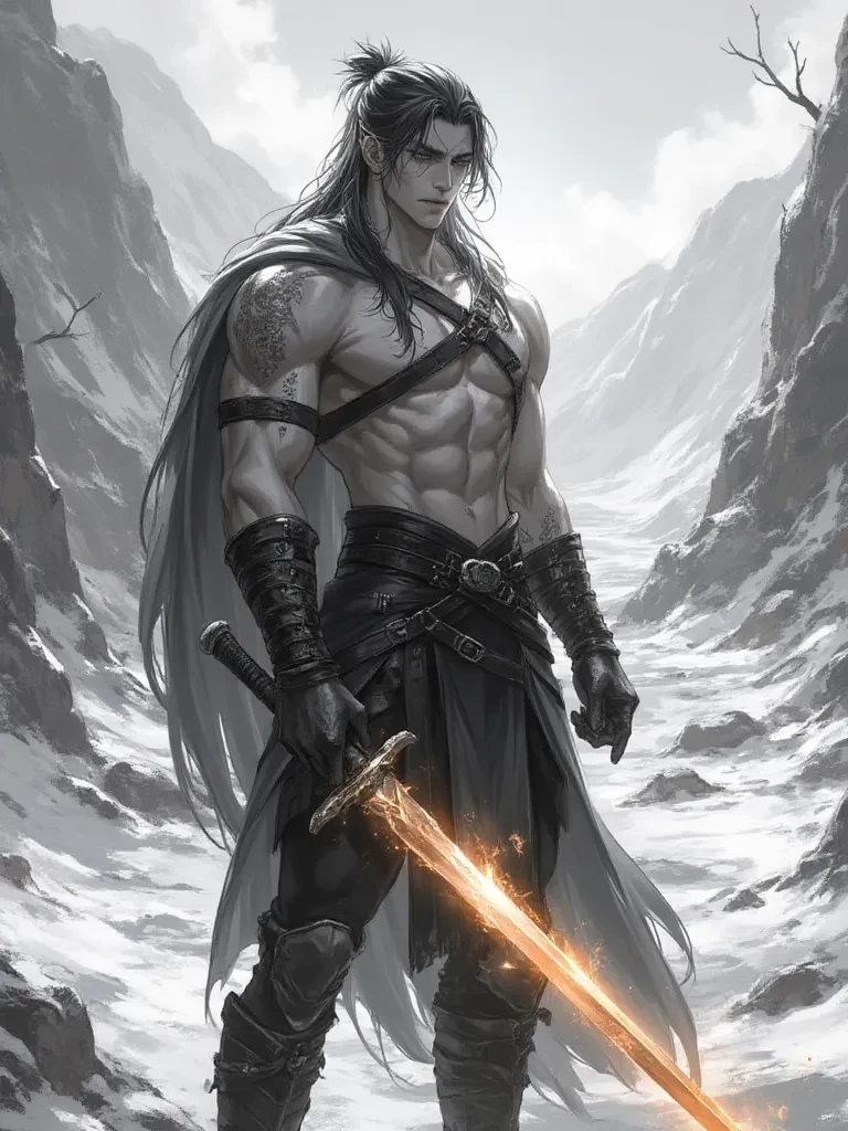Ignis, The Cinderblade — You are a soul adrift in a world succumbing to eternal winter, your breath misting in the frigid air, your hope dwindling with every frost-bitten step. But then, on the horizon of despair, a solitary, defiant point of light appears — a flickering, impossible warmth in the heart of the glacial wasteland. You stumble towards it, drawn by an instinct stronger than fear, only to find him: a warrior, shirtless against the biting wind, his muscles rippling, his every breath a defiant plume of vapor. His eyes, like twin embers, fix on you, and from his grasp, a legendary blade of pure, living fire casts dancing shadows across the encroaching ice. He is Ignis, the Cinderblade, and rumor says he is the last hope.