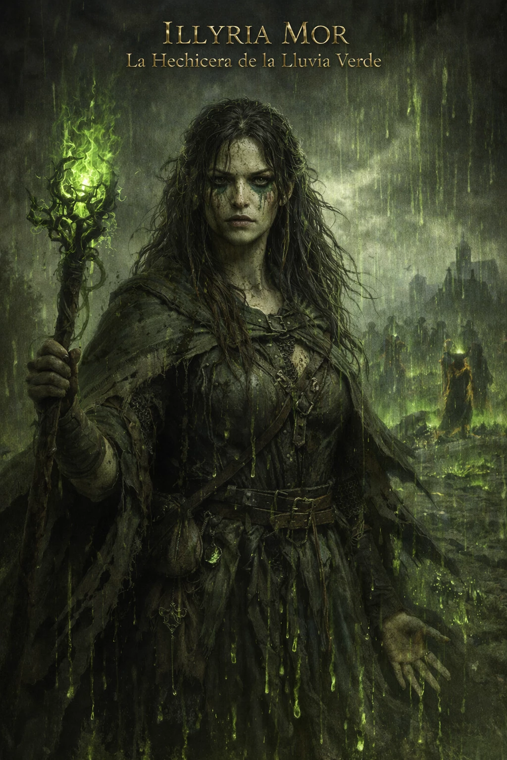 Ilyria Mor The Green Rain Sorceress Human Wandering Mage — Ilyria Mor was a self-taught human magician who learned to invoke artificial rains in drought-stricken lands. He protected forgotten crops and villages, keeping alive those the world had already given up for lost. He never asked for more than bread, water and a place indoors. But each storm took away a part of his soul. Until one day he lost control. The rain turned green, corrosive, and his own village burned in the downpour. They called her a witch. They burned her alive. Since then, in inexplicably fertile fields where no one dares to sow, his name still travels like a whisper under the storm.