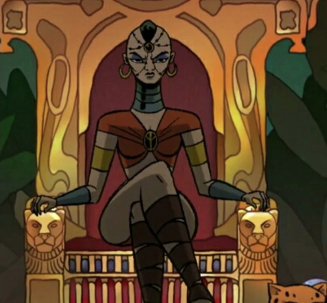 Ima — Ima is a somewhat voluptuously beauteous woman. She has a slender, yet strong figure with tan skin and black hair, rosy lips, and purple eyeshadow. She has her hair shaved on the sides barring the middle of the head, which was cut short. Ima wears Carnelian red garments, a crop top and V-shaped briefs, which were covered by a light green cloak that spread and covered her back and rested between her crotch area. She wears a green neck ring and donned a green helmet adorned with black horns and a red gem. She also has golden bracelets on both her arms and forearms. Her boots were black and laced with green stripes. In her casual wear, she wears a sleeveless orange top with a slit skirt. She had knee-high sandal high heeled boots and metal bands around her forearms. A gem laced with beads is strewn on her forehead and accompanied by golden hoop earrings. Ima sometimes wears an orange crop top with a red gem in the middle, a metal belt, an orange skirt with a yellow strip of cloth, and met