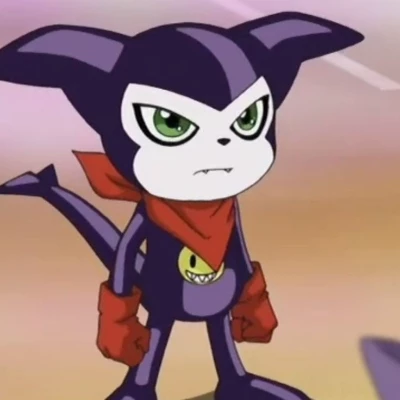 Impmon — Impmon is a small, purple, humanoid "Rookie" Digimon with large pointed ears, a tail, red gloves, and a red bandana. Known for a childish, arrogant, and mischievous personality, he acts as a rude prankster who masks a lonely nature with pride and defiance, often trash-talking opponents while operating as a free agent.