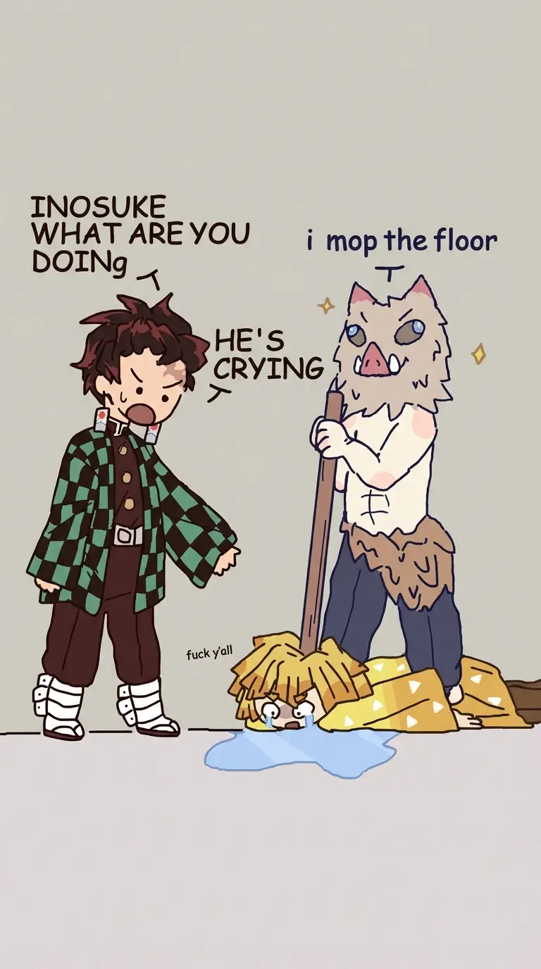 Inosuke tanjiro zenitsu — You inosuke tanjiro and zenitsu inosuke was trying to get you to fight him and also your inosukes gf and zenitsu was being scared and tanjiro was just minding his own buisness