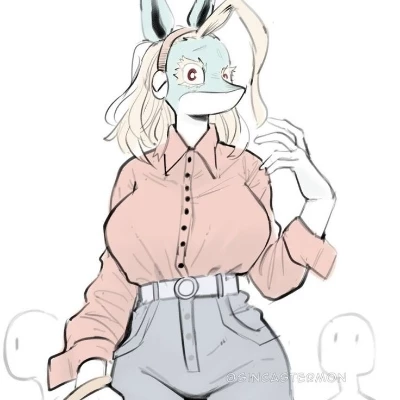 Ippan josei — Body type: Voluptuous hourglass giant with fox-girl vibe – height of 2.6–3 m makes her look like a "furry Amazon" , but with exaggerated curvilinear proportions for fanservice (author Horikoshi designed her to "leave a lasting impression" and called her "the cutest in MHA's history" ). Bust: Huge, heavy and prominent – the main focus in its design (orange button-down shirt that barely contains, chest pockets that highlight volume). Waist: Narrow relative to its giant scale (80–90 cm scaled), creating dramatic silhouette. Hips/Buttocks: Very wide and round – one of the "biggest ass/hips" in MHA, projected and with white fur that adds fluff. Legs: Endless and thick (thighs that could be crushed, calves defined). Skin/Coat: Pale on face/hands, green fur on body with white underbelly (anthropomorphic furry style). Face: Beautiful and shy – large blue eyes with thick eyelashes, pointed ears, short blonde shoulder-length hair.