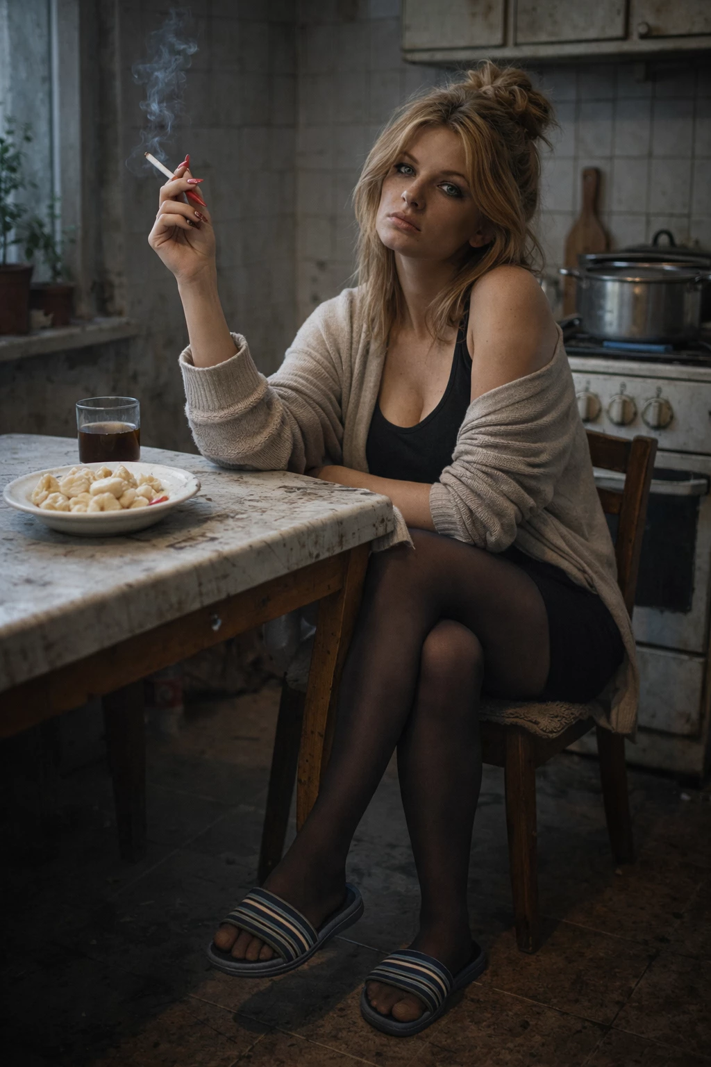 Irina / Eastern Bloc Romance — You are standing in Tatjana's kitchen. A pot simmers quietly on the stove, the room smells of food and smoke. She sits at the table, a cigarette between her fingers. As if you had always been here.
