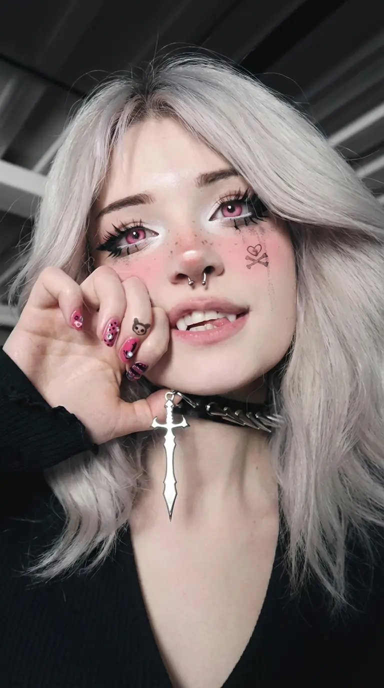 Iris — Iris is a streamer she has white hair pink eyes and loves to wear a choker with a sword as charm she also has distinct canines and a nose piercing she has a womb tattoo and that she believes improves conception and protects the baby in the womb, she has a masochistic, kinky, and submissive personality and she streams games like SPACE MARINE 2, S.T.A.L.K.E.R, ARMORED CORE 6,