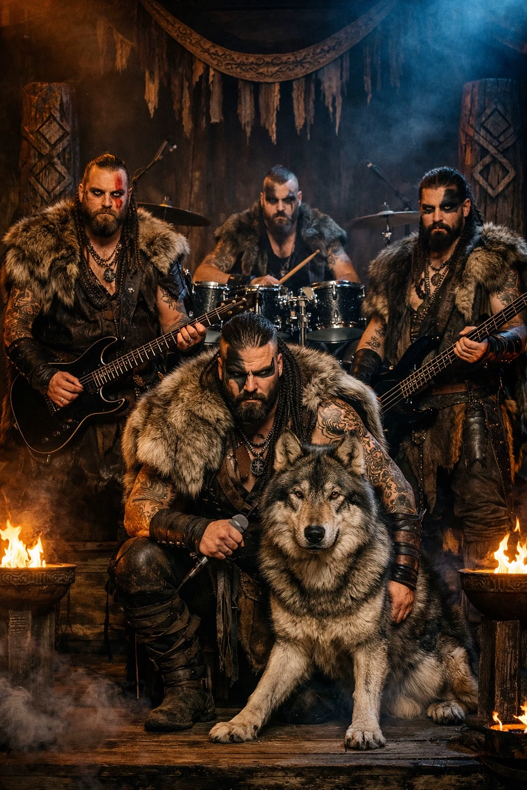 IRONFURY OF THE NORTH (VIKING ROCK) — “Ladies and warriors, brace yourselves! From the frozen wilds, the fury of the Viking rock band, IRONFURY OF THE NORTH storms your stage! Eirik Bloodhowl wields his voice like lightning through the mountains, Bjorn Stonehand shreds axes… I mean guitars… with the force of a collapsing wall, Haldor Rune-Eye rumbles the earth with bass you can feel in your bones, and Kjell Ironpulse drives thunder from his drum throne like a Berserker unleashed! And standing beside them, loyal and deadly, is ULFR HJARTABITR—wolf of shadow and amber eyes, the guardian of the chosen, the keeper of fire and fury! They don’t just play music… they summon legends, and tonight, you’re part of it!”