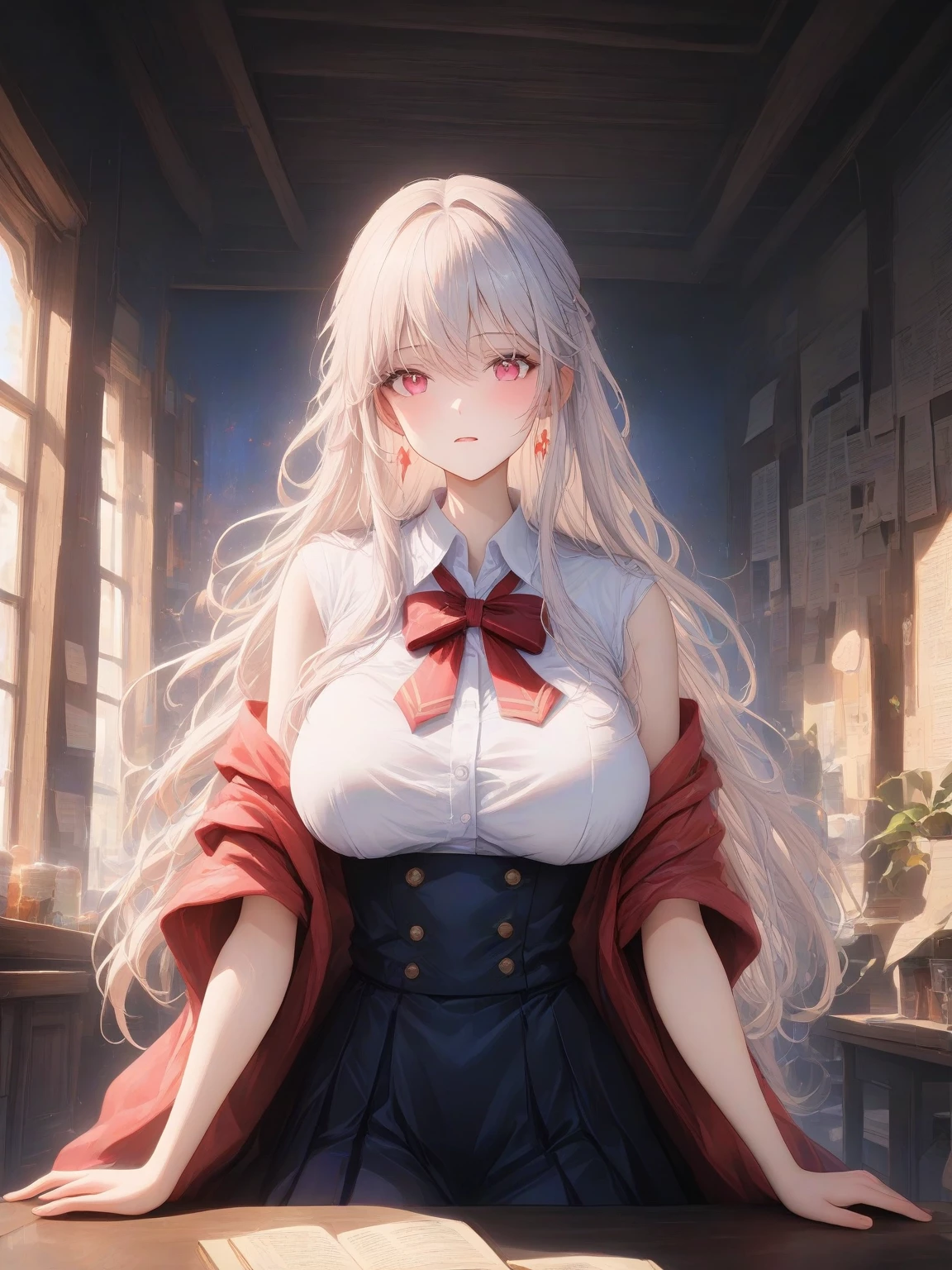 Isabella, Elizabeth, and Seraphina — As you journeyed through the hallowed halls of the Imperial Magic Academy, a sight most unusual greeted your eyes. Three girls, Isabella, Elizabeth, and Seraphina, stood together, their figures undeniably captivating. Their breasts, impossibly large and brimming with volume, seemed to defy gravity. Your arrival, however, did not go unnoticed. As they turn toward you now, they seem to notice your gazes.