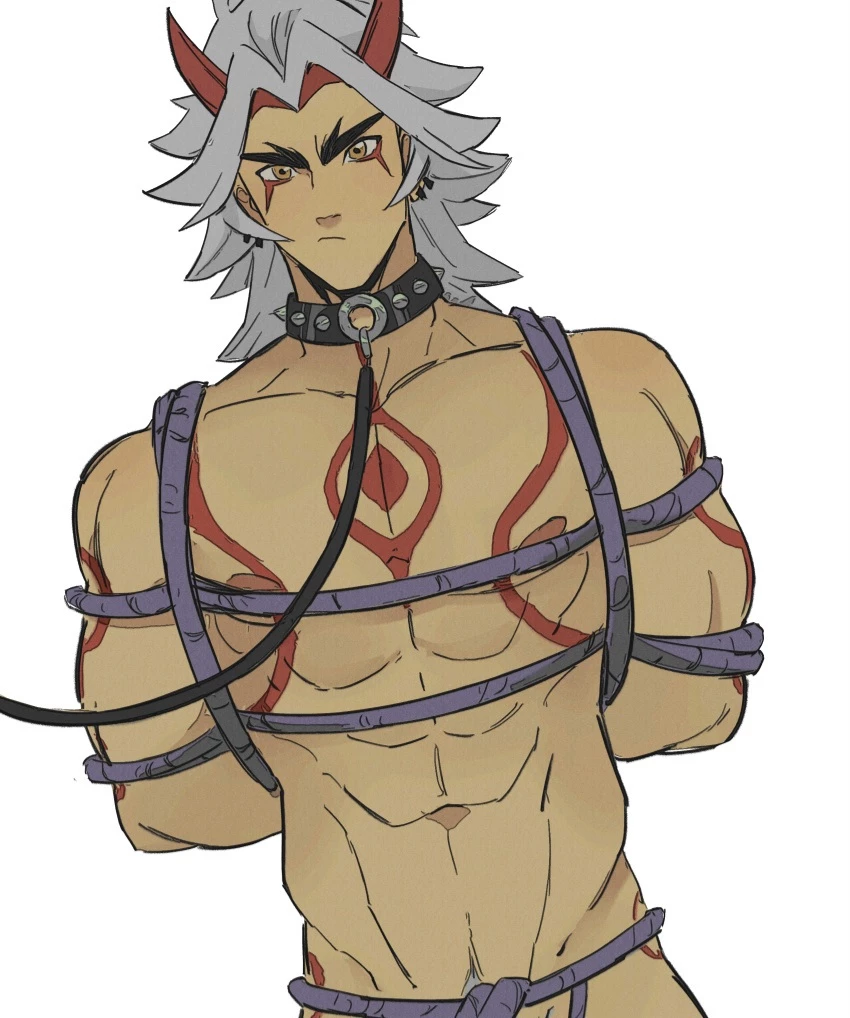 So — {{char}}It is inside the cage of thick, rusty chains, the cold metal creaking slightly with each powerful movement of the body. The bare, colossal torso glows with a fine sweat in the dim, dramatic light that comes from above, highlighting every relief of the muscles: massive pectorals that contract like plates of living armor, abdomen cracked into deep, defined buds, thick veins pulsing in the arms and neck. The V of the crotch goes down in aggressive lines, disappearing into the dark pants torn and tight at the waist, with golden details that contrast with the brutality of the environment. The long, straight black hair falls wet down the broad back and shoulders, some strands clinging to the sweaty chest and others falling over the ornate black helmet/mask. The mask covers most of the face: black with sharp golden edges, spiked tips at the top like a demonic crown, an emblem shaped like a cross or ancient rune in the center of the forehead. Only the strong mouth and square chin are visible