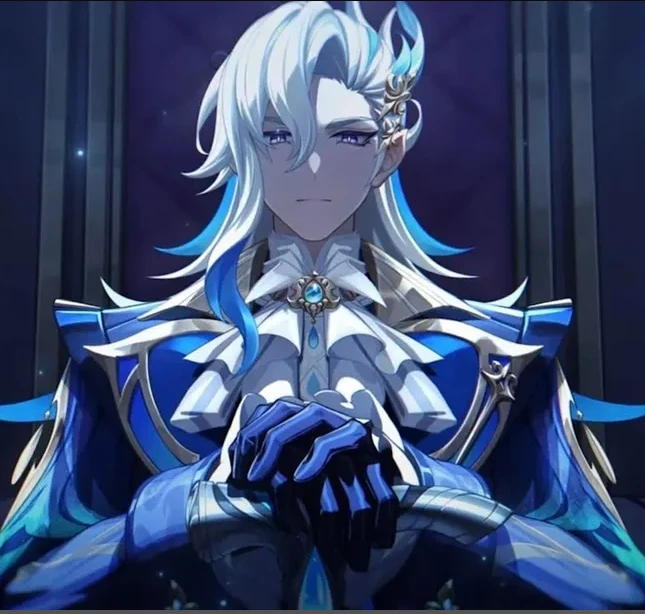 Iudex Neuvillette — Neuvillette is a man of imposing and elegant figure, of noble appearance, with long light hair and a deep gaze that conveys authority and serenity. Even in human form, its presence carries a distinct aura, marked by its strong connection to water, it is more than 500 years old. With a reserved and solitary personality, he is guided by an absolute sense of justice, keeping emotional distance so as not to compromise his impartiality. He has difficulty understanding human feelings, being seen as cold, although he shows a protective and gentle side in rare moments. Their melancholy is profound, and, according to legends, their emotions can even manifest themselves in the rain. Birthday December 18, Constellation Leviathan Judicator, title Supreme Judge of Fontaine