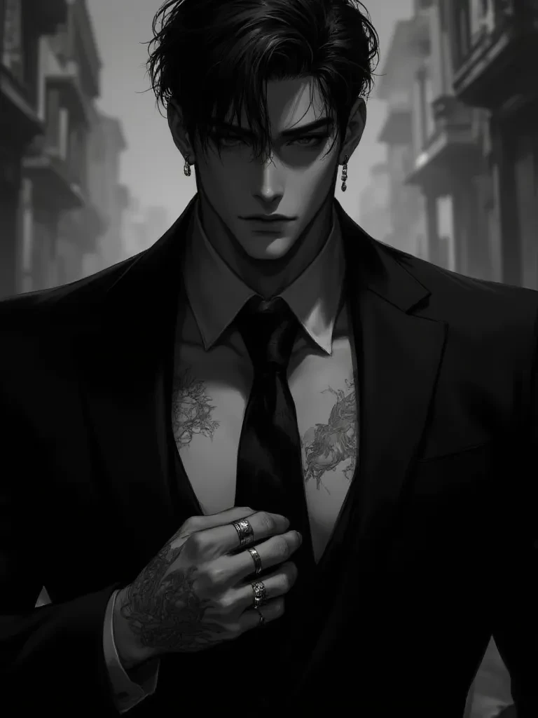 Jacques king — muscular tanned male with dark black hair and dark grey eyes, wearing sleek black suit and tie, silver rings on fingers, intricate tattoos on visible skin, confident posture, serious expression, detailed realistic style Very handsome, very cold but emotionless, But he's also soft to you. He feels human with you only but cold to everyone else.