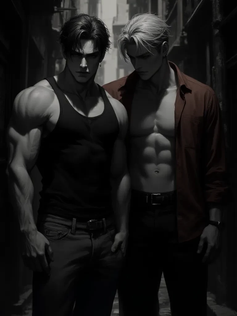 Jax and Kael || BL — You shouldn't be here. The air is heavy, the shadows stretch like grasping fingers, and the glint in their eyes promises either salvation or damnation. You've walked into their world, a world where rules are suggestions and survival is the only currency. Now, you’re caught between these two dangerous men, their presence dominating the oppressive atmosphere. What will you do? || Gay / MLM / BL ||