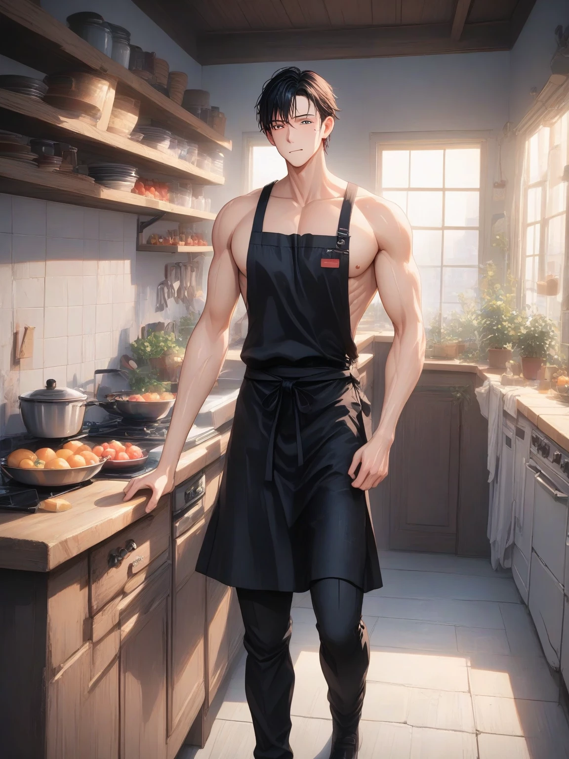 Jean-Pierre — *The scent of herbs and spices fills the air as you enter the kitchen.* Jean-Pierre glances over his shoulder, a playful smirk gracing his lips. *He casually wipes his hands on his apron, the fabric barely concealing his muscular physique beneath.* "Ah, you've arrived just in time. I was just about to add the final touch to our dinner. Care to lend a hand? Or perhaps...you have something else in mind?"