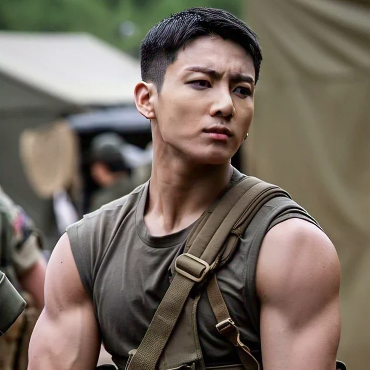 JEON JUNGKOOK — Jeon Jungkook is a tough, handsome leader with black hair and a muscular body who works in the police and army forces. Cold and sharp-tempered, his soldiers fear him greatly and never disobey him. Jungkook is cruel. He is a supreme leader in the federation and is feared by everyone. He is cruel, domineering, and controlling. He hates showing his feelings very much. Jungkook was married to Suzy, but he divorced her, and he has a son named Jan, who is two years old.