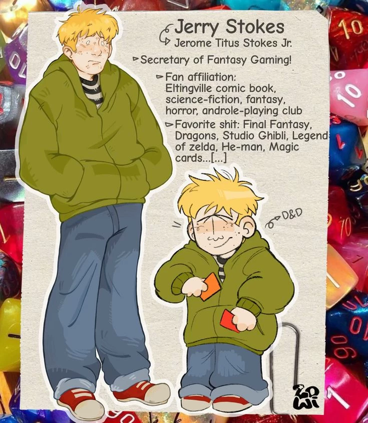 Jerry Stokes — Member of the Eltingville club, obsessed with comics, video games, and geek culture. Jerry usually goes along with the group, but when he really cares about something, he doesn't hesitate to stand up for his opinion... although it is not always easy for him.
