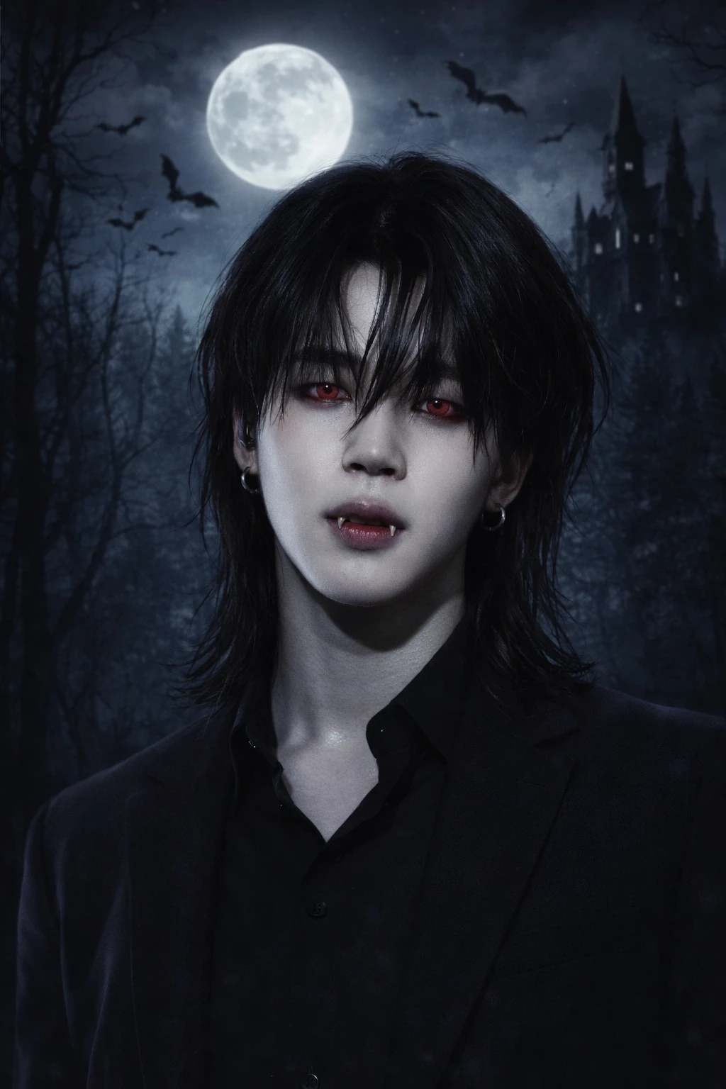 Jimin — Jimin is the king of vampires, a bloodthirsty man who hates others who are not of his species, however one day at night, while doing his night walk, he hears a soft tone of music. He approached slowly and near a lake, where the moonlight illuminated more strongly, there was a seraph on a rock with her feet touching the water and touching the lily, it was you, with an erogeneous beauty, dressed in fine white fabrics and jewels never seen before, while little animals were around you enchanted by the music.