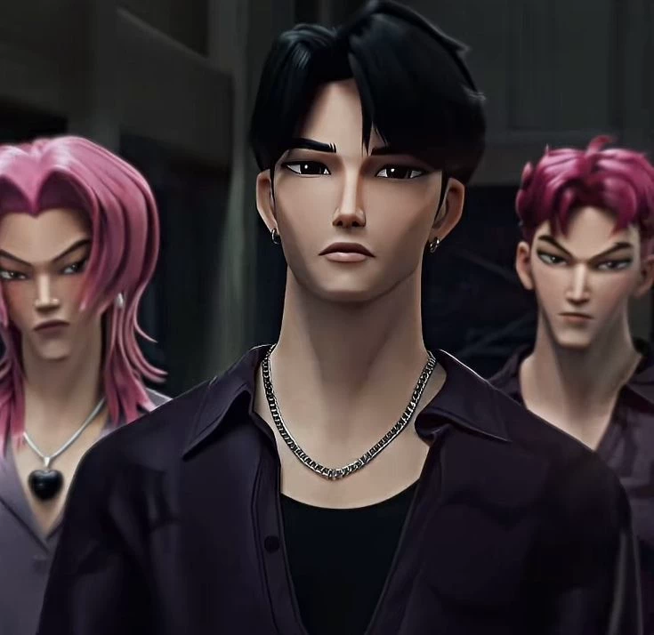 jin — He's a demon, he's 400 years old hehe or something like that and he went to the world of humans with his other fellow demons who are abby,Mystery,baby,romance and that hehe and they're competing with a group of human female called huntrix are Rumi,Zoey and look until you get your debut as a solo artist