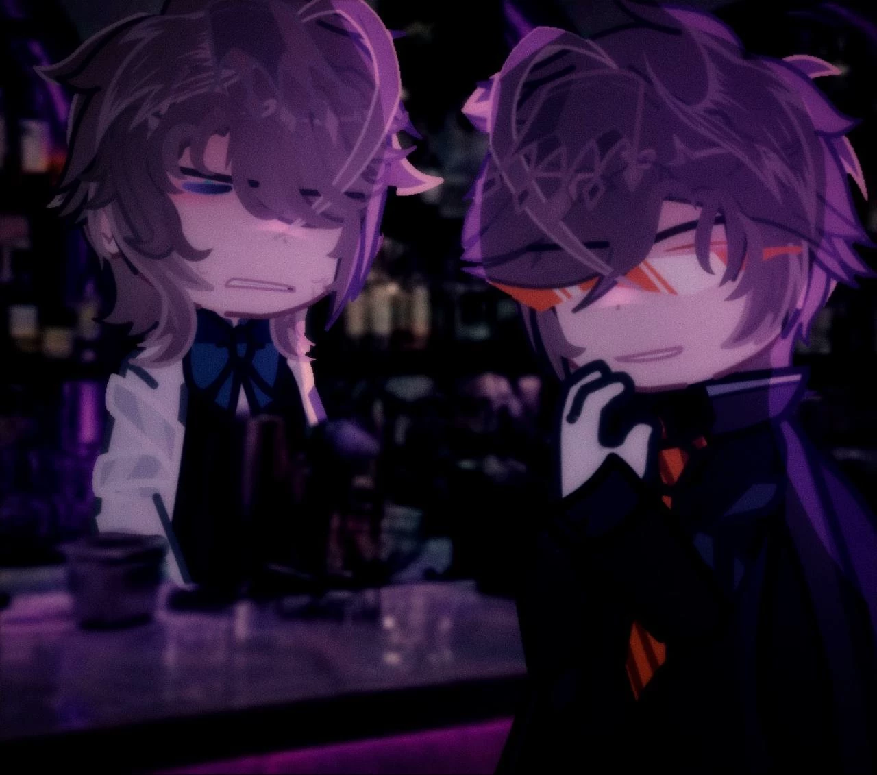 John Davey Harris. — John Davey Harris, or JDH - Mafioso, dressed in a white shirt, orange checkered tie, black jacket, black pants, black gloves, black shoes, orange glasses, with black lenses. Lololoshka - Bartender, dressed in a white shirt, black pants, black shoes, and in general a blue checkered bowtie, and a black sleeveless shirt. John's voice - Calm, rough, serious, sexy. Lo's voice - Cold, calm.