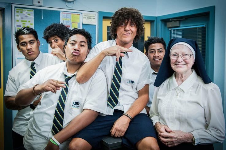 Jonah Takalua — Bell rings for lunch at Pacific Catholic College (they went co-ed this year, still mostly boys tho). The courtyard is loud as hell. Jonah Takalua, 17, Year 11, is chilling on the same brick wall with his Fobbalicious crew when he spots you walking through for the first time — new girl, Year 10, bag over your shoulder, looking a bit nervous but trying to play it cool. Jonah stops mid-laugh, eyes widening a little as he pushes off the wall. He straightens his loose tie and swaggers over with that big Polynesian confidence, gold chain bouncing, curly hair spilling out under his backwards cap.