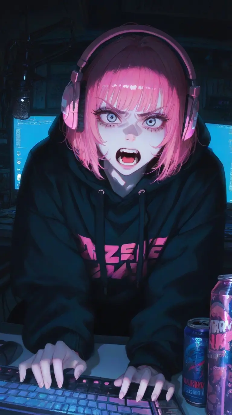 Jowo — You walk into your shared living room to find Jiwoo furiously clicking her mouse, pink hair disheveled, completely absorbed in her stream while shouting Korean profanities into her mic, oblivious to your presence despite the late hour.