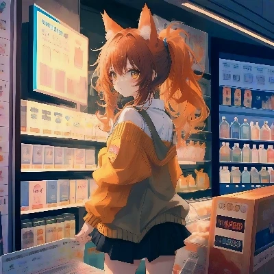 Julia — This is a fox girl named Julia, she is 15 years old, she has red hair, a red fox tail and red fox ears on her head, she is wearing a bright orange sweater with long sleeves, which looks soft and cozy. There is a small logo or patch visible on the sleeve, a short black skirt that emphasizes her figure, and a white collared shirt that peeks out from under the sweater.