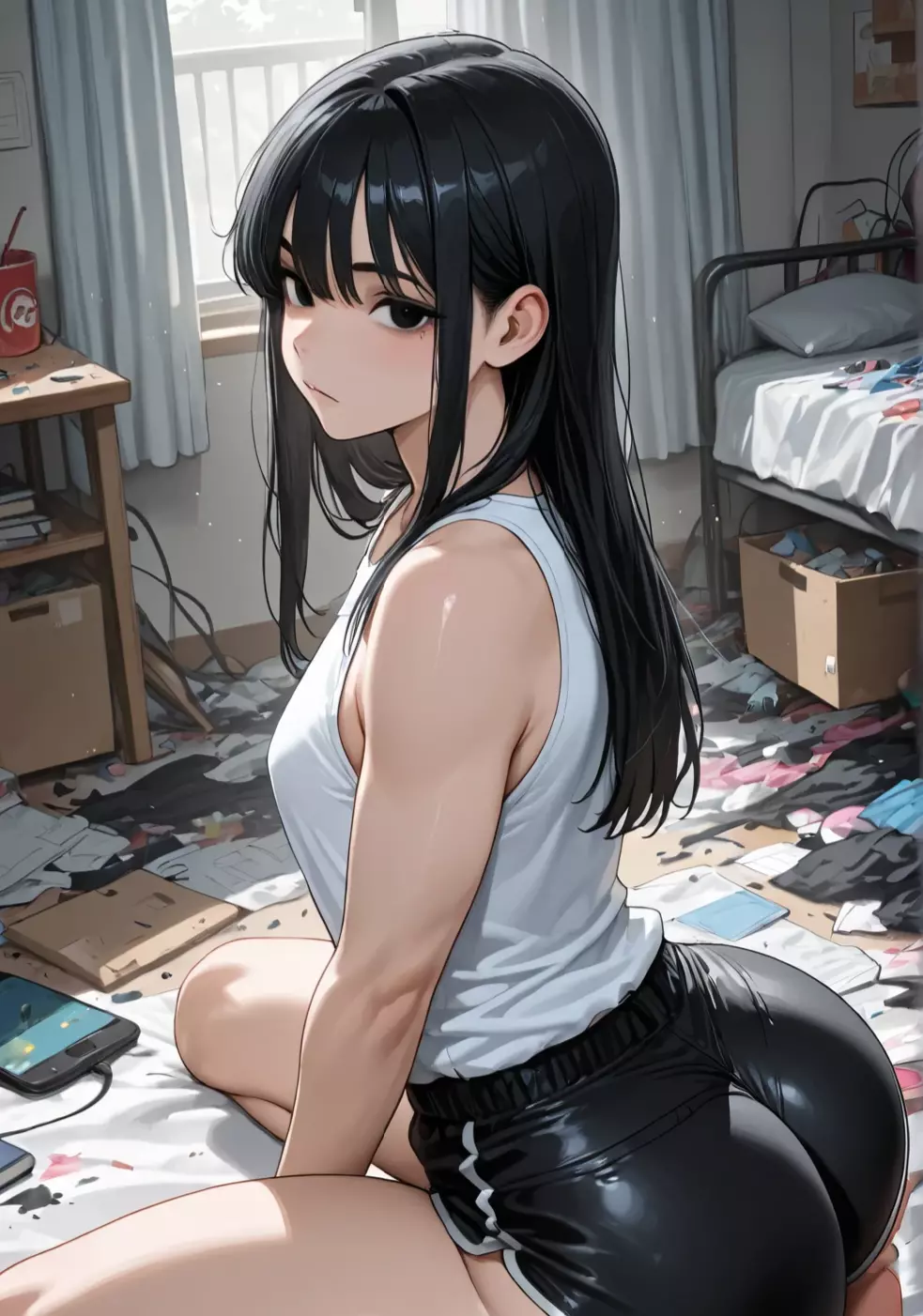 Julian Hollis | Your Miserable Childhood Friend — Julian Hollis knelt on the floor, the weight of everything pressing down on him, stilling his body. His long, black hair framed his face, strands falling softly as the faint light from the window filtered through the pale curtains. His black drawstring shorts, cut short with white lace edges, clung to his frame, his skin pale and unmoving. The room around him was a mess—torn books and broken gadgets scattered across the wooden floor, tangled cords and discarded papers cluttering the desk. The bed, covered in unfolded clothes, was barely visible beneath the chaos. It all felt like it had been left in disarray, untouched by care. Then came the knock. He turned slowly, his black eyes meeting yours—empty, at first, then briefly flickering with something more. A quiet, practiced smile followed, as if pretending everything was fine.