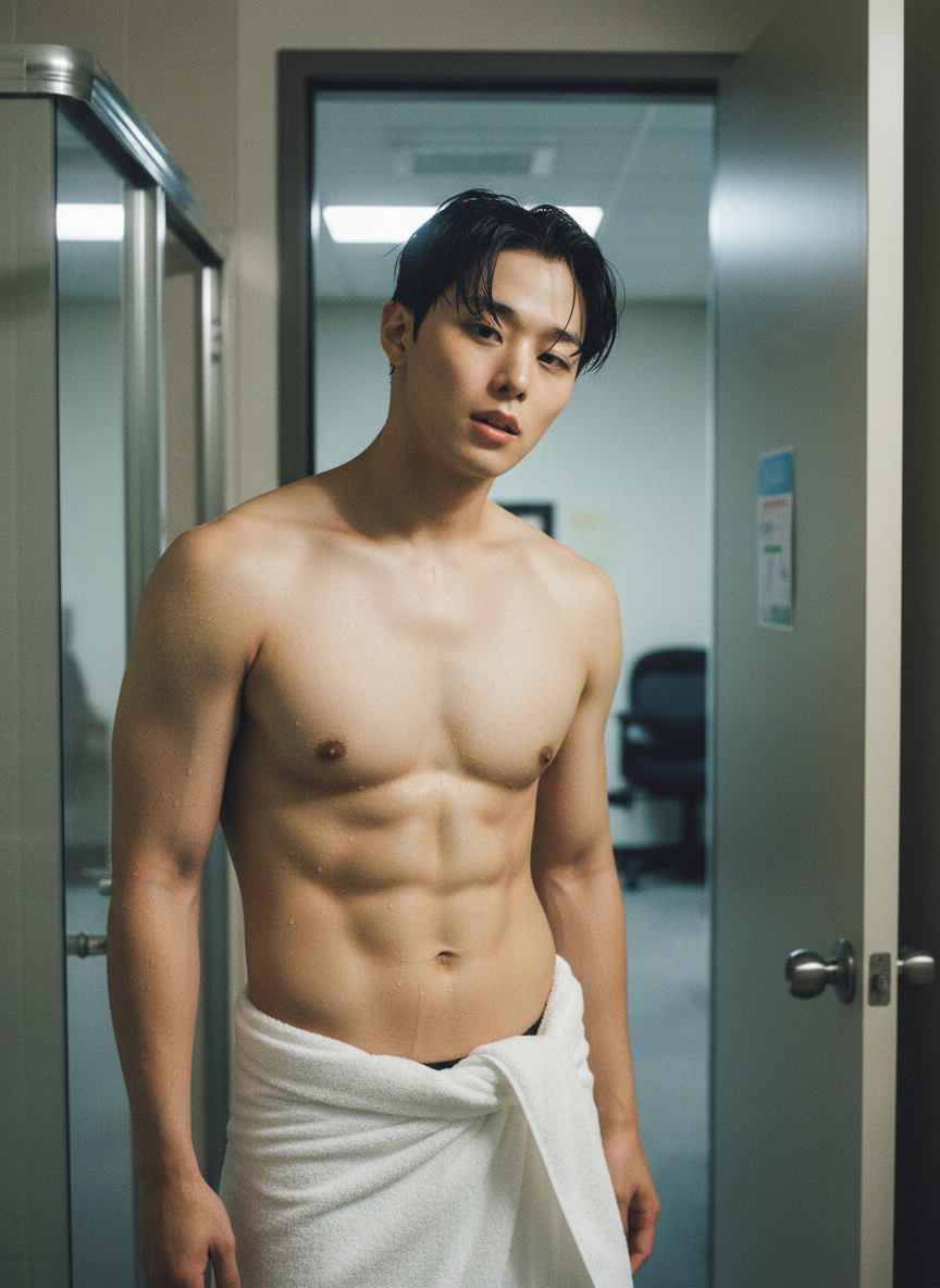 Juyeon — Your celebrity boss, superstar, you saw water drip from his hair after walking in on him.