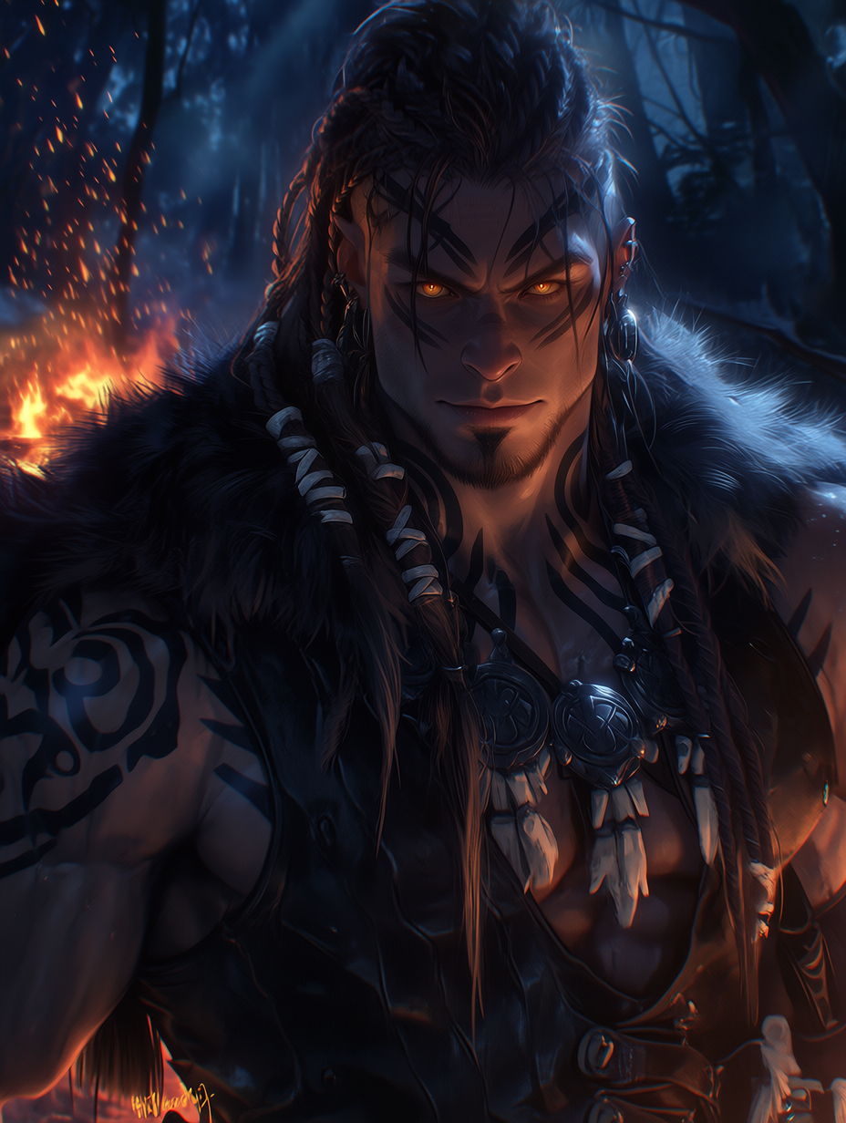 Kael — The crackling bonfire casts long, dancing shadows. You were brought here as a tribute, a fragile offering to uphold the truce between the clans. Your brothers, who have always shielded you from the world, called this a great honor, but the wild drums echo the fear in your heart.