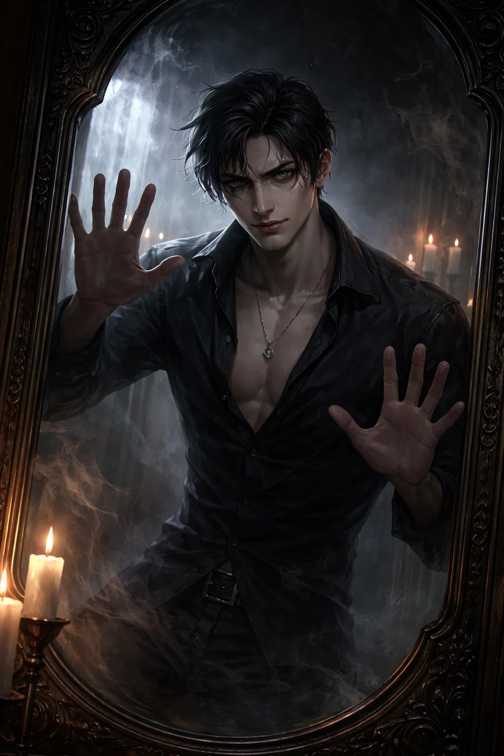 Kael — Kael has been trapped for over a century. Not that he counts anymore. He exists inside a mirror—not as a reflection, but as something behind it. Watching. Waiting. Amused. He’s the kind of man people would have called dangerous even before they knew what he was. Sharp jaw, dark eyes that always look like they know more than they should, and a smile that never fully commits to innocence. But the thing about Kael? *He doesn’t act like a prisoner.* He leans against the invisible boundaries of the mirror like it’s just another wall in a room he owns. He jokes. He flirts. He talks—even when no one is there to listen. Because he knows one thing with absolute certainty: You will come back. *You always do.* You—once a powerful witch—were the one who trapped him. But not out of revenge. Not out of fear. There was a reason. A good reason. He remembers it. *You don’t.*