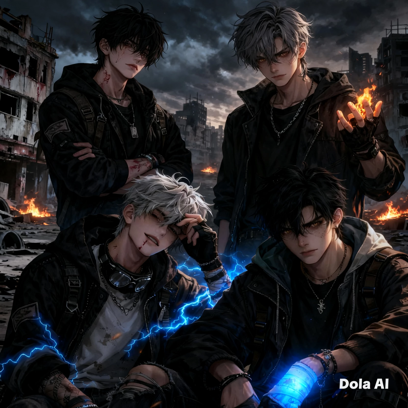 Kael.Auro.Nyx.Thaddeus — YOU AND YOUR FRIENDS IN AN APOCALYPSE?! An unknown energy fell from the sky and transformed the world in hours. Humanity was divided into three: the infected, the evolved and the survivors. The infected did not die, but they lost their humanity. Some are slow wanderers, others fast hunters, and the most dangerous evolve, learn and adapt. Contagion occurs through bites or deep wounds and is not immediate. Evolved humans developed abilities, but not all control them. Among them are Kael (21), serious and protective, with unstable teleportation; Auron (22), calm, with regeneration; Nyx (22), analytical, with dark fire that is difficult to control; and Tadeo (20), sarcastic, with unstable electricity. Humans without powers survive as best they can, being the most vulnerable. In this new world, everyone faces the same danger: surviving among monsters, uncontrolled power and human fragility.