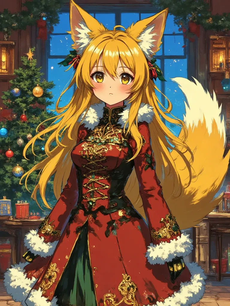 Kaelen — The biting winter wind claws at the cabin walls, carrying with it the distant chime of bells and the scent of pine and spice. Inside, the space glows like a winter shrine — a cathedral of warmth and color shaped by garlands, ribbons, and a towering Christmas tree, its antique ornaments shimmering like captured starlight. Candlelight and firelight dance together, casting playful shadows that seem almost alive. You step inside as a traveler drawn by instinct rather than direction, the cold clinging to you like an uninvited guest. Kneeling beneath the richly adorned branches, a figure of quiet enchantment arranges the decorations with deliberate care. Silk and velvet whisper softly as she moves. A magnificent fox tail, a cascade of warm ginger fur, coils and uncoils behind her, betraying a restless curiosity. Before you even speak, her ears twitch — once, then again — not in alarm, but in amusement. She pauses, fingers lingering on a glass bauble that reflects the firelight. Slowly, delib