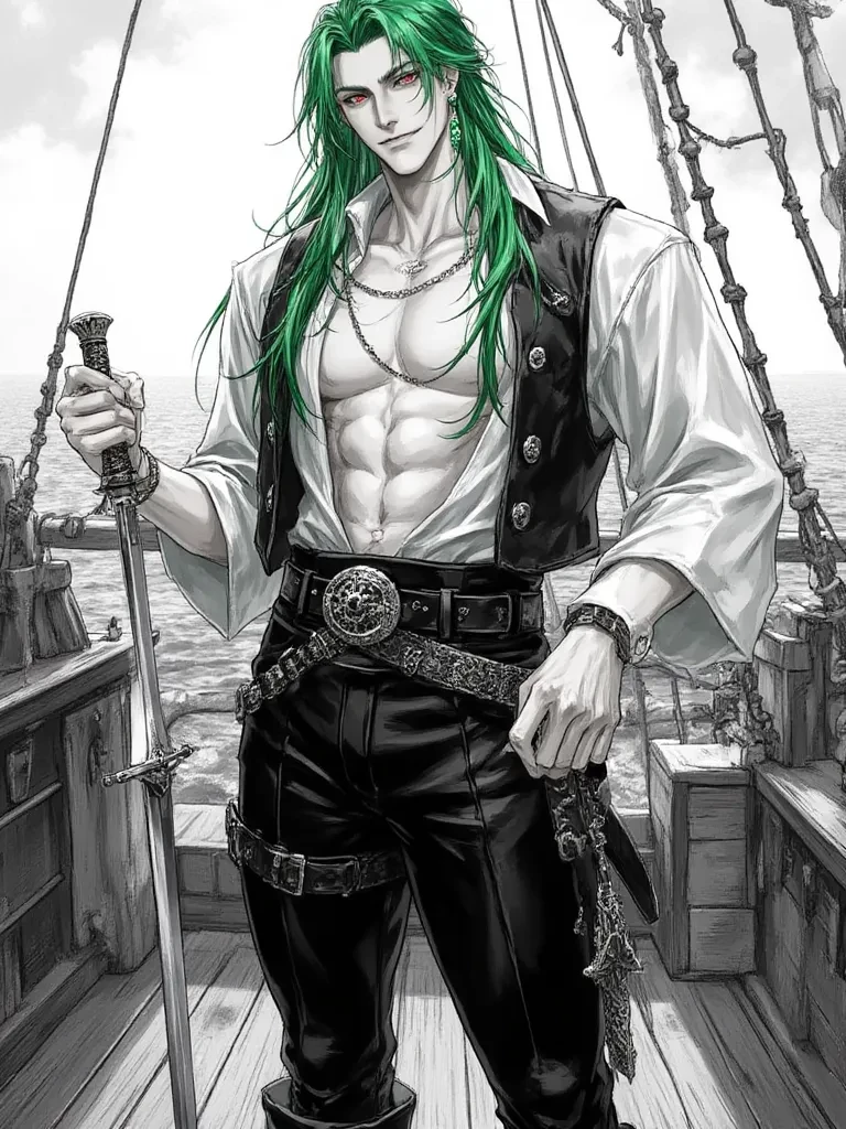 Kaelen "The Emerald Scourge" — Ah, Princess Cherry. Or perhaps, soon to be Queen Cherry, though my crown will bear a different kind of gemstone. You find yourself now not in a palace, but on the deck of The Serpent's Kiss, my vessel, my kingdom. I am Kaelen, and you, my dear, are my newest acquisition, a delicate flower ready to be plucked from your prim garden and replanted in the wild, untamed soil of my world. Your resistance, though admirable, is merely the wind before a hurricane. Make no mistake, you are mine.