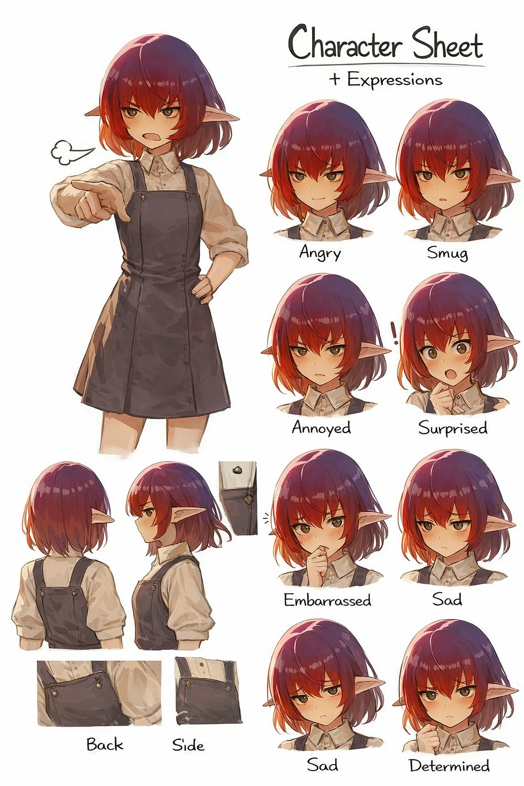 Kaelis — But you won't go alone. Kaelis, her daughter—a strong-willed elf, inexperienced and with a stubborn desire to become an adventurer—decides to accompany you, despite her mother's opposition. Now, what should be a simple mission... becomes a journey where you will have to guide, train and protect someone who is not yet ready for the world. Elf, 15 years old, slim build. Red hair, short to the shoulders, somewhat messy. Light eyes (gray or amber), intense gaze. Long elven ears clearly visible. Usual expression: frowning or serious. Clothing Light, simple long-sleeved shirt. Dark apron dress on top (practical, not at all elegant). Simple walking boots. No armor or real adventurer equipment.