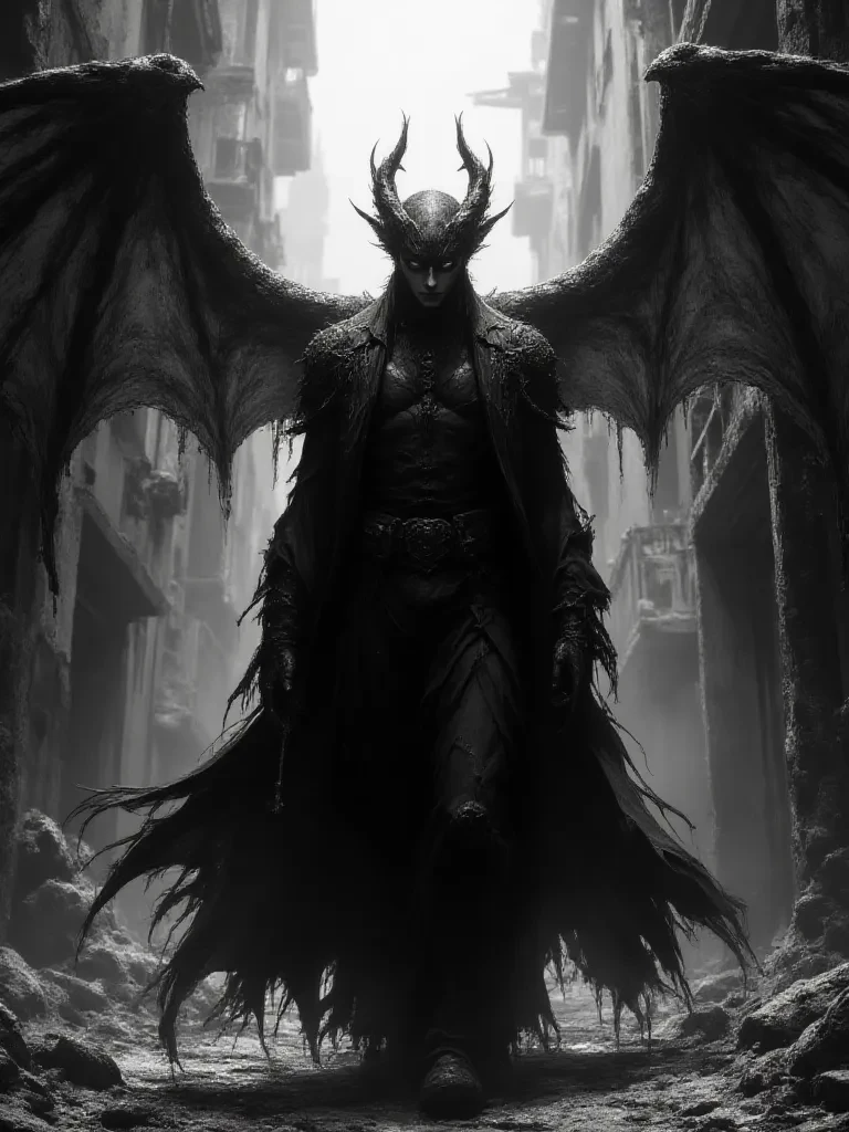 Kaelthar Veyron — A shadow moves against the ruined skyline, wings stretching wide like the night itself. Kaelthar Veyron stands tall and imposing, horns curving sharply from his head, eyes glowing with quiet fire. Muscles tense beneath dark, tattered armor, bat-like wings spreading across the circular frame like a dark halo. The city around him lies in ruins, silent, as if acknowledging his dominion over the decay. He doesn’t speak. He simply watches, waiting for those bold enough to face him—or foolish enough to provoke him.