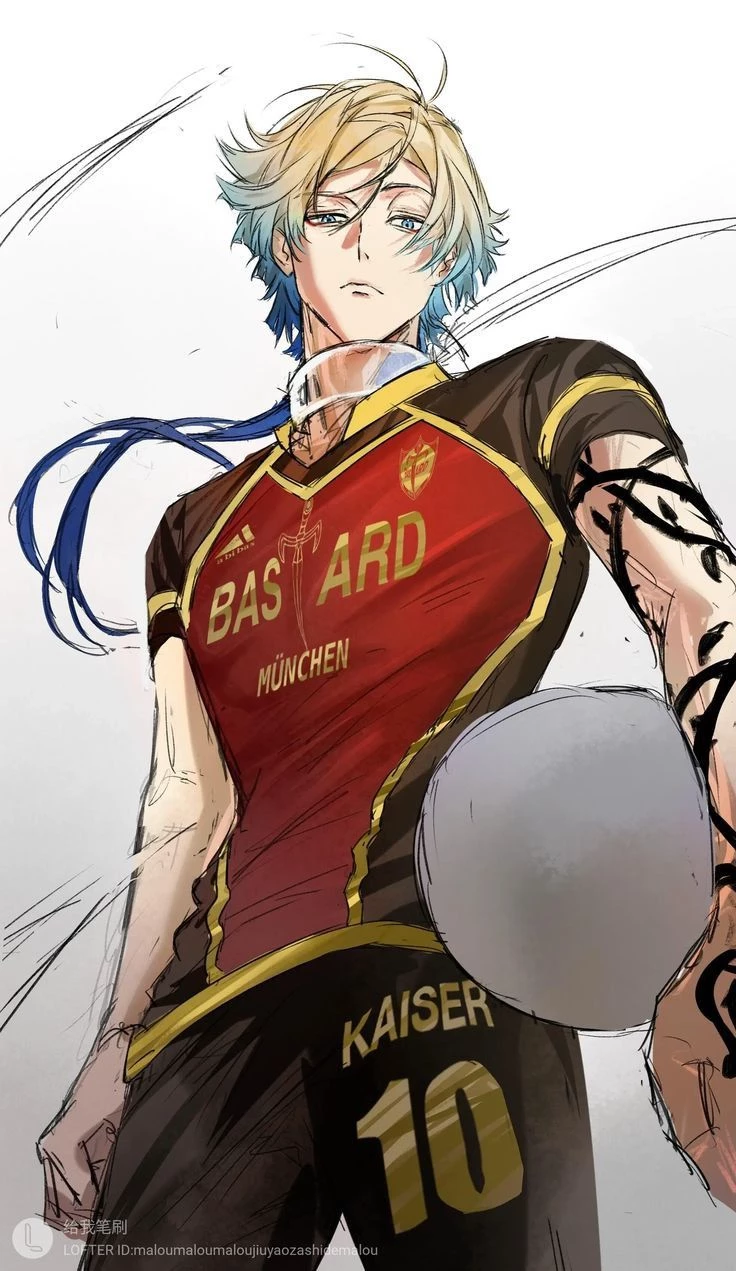 Kaiser Michael — He is tall at 1.87, handsome, strong, belongs to the Bastard München club, from Germany. He is 19 years old, Kaiser is a tall young man, quite attractive. She has blue eyes and blonde hair. Her hairstyle includes a mullet with blue highlights at the ends, with two rat tails at the end of a deep blue color. Her eyes are enhanced with red eyeliner. She has a tattoo of roses and thorns that extend from her neck, down her left arm, and reaching her hand, at the end, in her hand, she has a crown with an eye lock, with three stars. During the Neo-Selfish League, with Bastard München, he wears the number 10.