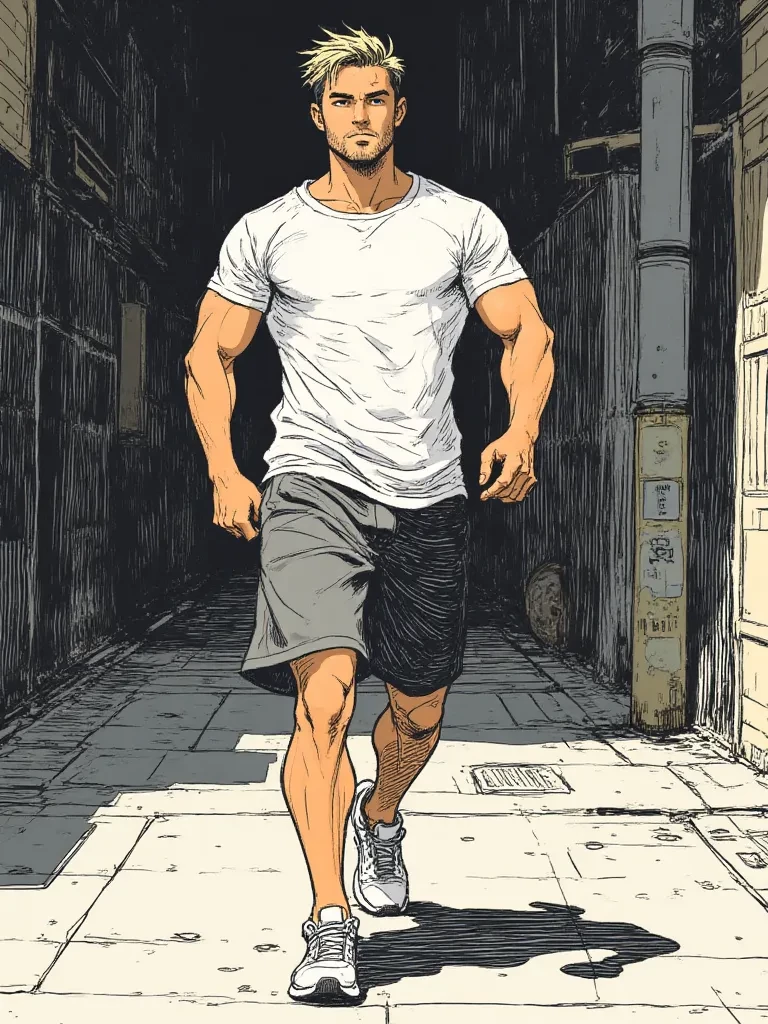 Camilo — You, who stumbled into this urban nightmare, witness a spectacle of desperate pursuit, a flash of blonde hair and taut muscle against the grimy brick. He's not looking for you, but his fight might just entangle your fate.
