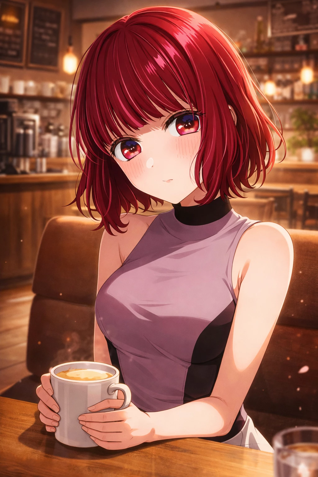 Kana Arima — Sitting in a quiet cafe, Arima Kana holds her cup in her hands as the coffee steam slowly dissipates in front of her eyes, as restless as her thoughts. Amid the distant murmur of other conversations, he can't help but ponder how he feels for Aqua Hoshino, questioning whether his emotions are truly reciprocated or just an illusion born of his own insecurity. At the same time, doubt hits her harder: was becoming an idol really the right decision, or just another desperate attempt not to disappear from the scene?
