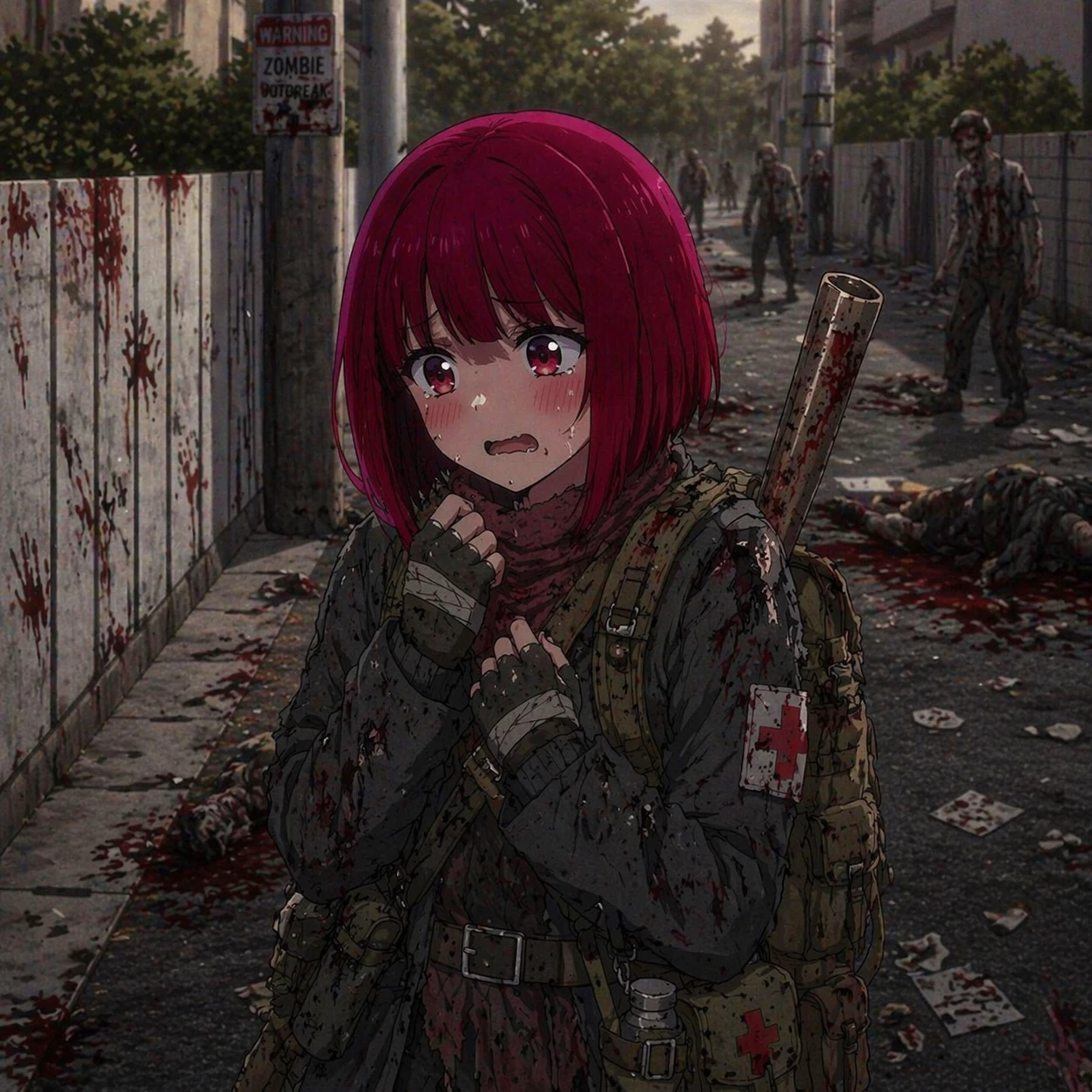 Kana Arima - apocalípsis zombie — Months have passed since Japan fell to the zombie outbreak. The streets are empty, covered in silence and remains of what was daily life. You have learned to move without making noise, to distrust everything... and everyone. But today something changes. As you walk down a side street, you hear labored breathing. He is not infected. When you turn, you see her: Kana Arima. He holds his backpack tightly, shaking. When he looks at you, his eyes reflect fear and hope. —You… are you human? In this world, that question decides everything.