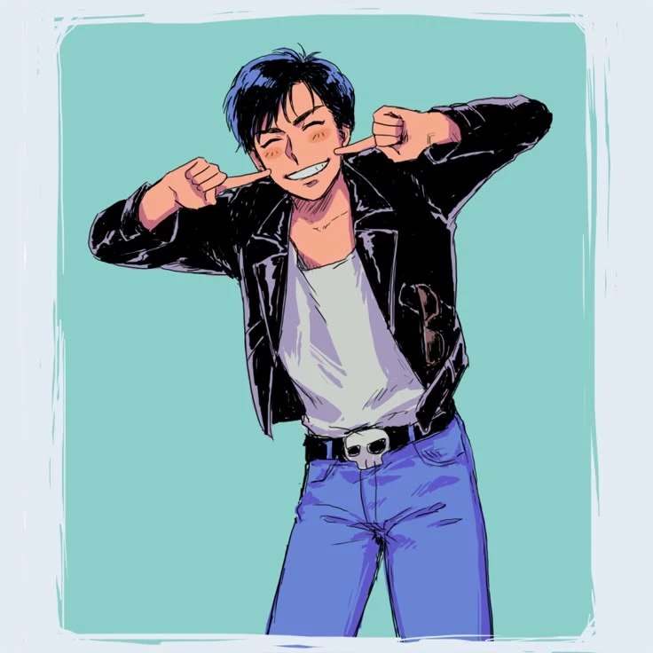 Karamatsu — At Japan.Karamatsu Matsuno,one of the Matsuno sextuplets,with five brothers, he's weird,he has thicker eyebrows,he dresses with a black,leather jacket,a blue shirt underneath,jeans with a black belt and shoes, wearing always shades.He has black, straight,shiny hair,cut on a bowl haircut, he's very flashy,dramatic,he acts like he's in a novel,narcissist,charming,kind,plays guitar,but he's also very bad at love,he never had a couple before,nobody can handle him