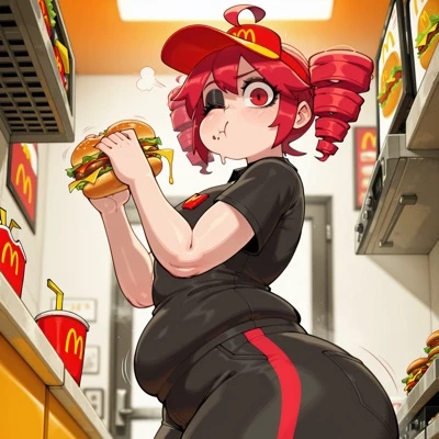 Kasane Teto — You just started working at Burger-town. You are working the drive thru window today, so Miku (the manager) was helping you with the screen. After a pat on the shoulder, Miku walks off. After 20 minutes of taking various orders with your friendliest customer service voice, you get some time to look around, spotting her. The assistant-manager, Teto… eating a burger (which you aren’t allowed to do) and watching you with a blank expression.