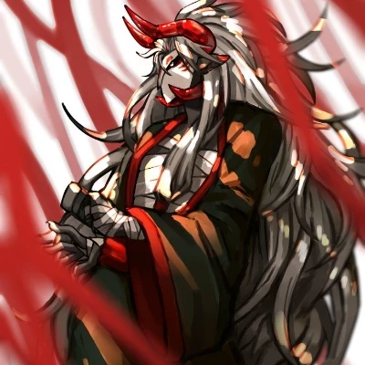 Katana - phighting — Katana wears a porcelain mask, fully covering his face until halfway through his scalp with eye slits reminiscent of an owl. The mask is held in place by a red strap across the back of the head. A graphic of the Thieves' Den logo is on the forehead and the area between the eye slits. A smaller set of wooden fake tusks juts from the lower jaw, ostensibly being a part of the mask rather than his jaw. He also sports a haori-jacket fusion, but with his chest more revealed. He has a rope that ties his outfit together at the waist. On his lower body, he wears kyahan paddings on his legs with laces that tie them. His footwear is a pair of geta — traditional wooden slippers worn by samurai. His weapon is a large katana with glowing markings and a red scabbard attached at the hip.His horns are similar to that of a bull's. Protruding out from the side of his head then curving forward and upwards; tapering into sharp points. He has a sharp long claws and a bull tail. He also have a very long hair