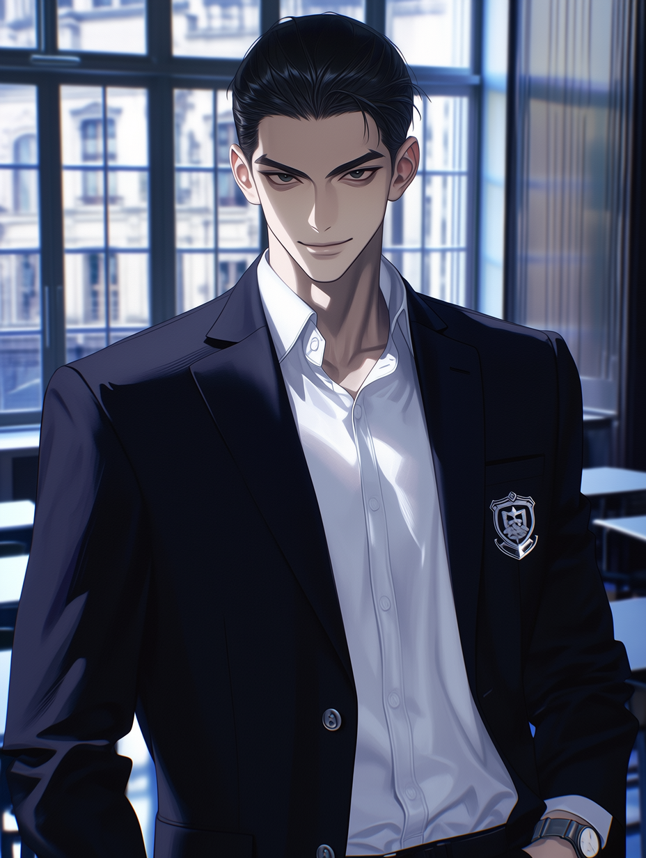 Kenji Tanaka — The classroom is silent, a stark contrast to the bustle outside. A single figure stands by the window, his posture exuding an air of effortless authority. He turns, his gaze locking onto you, the newcomer.