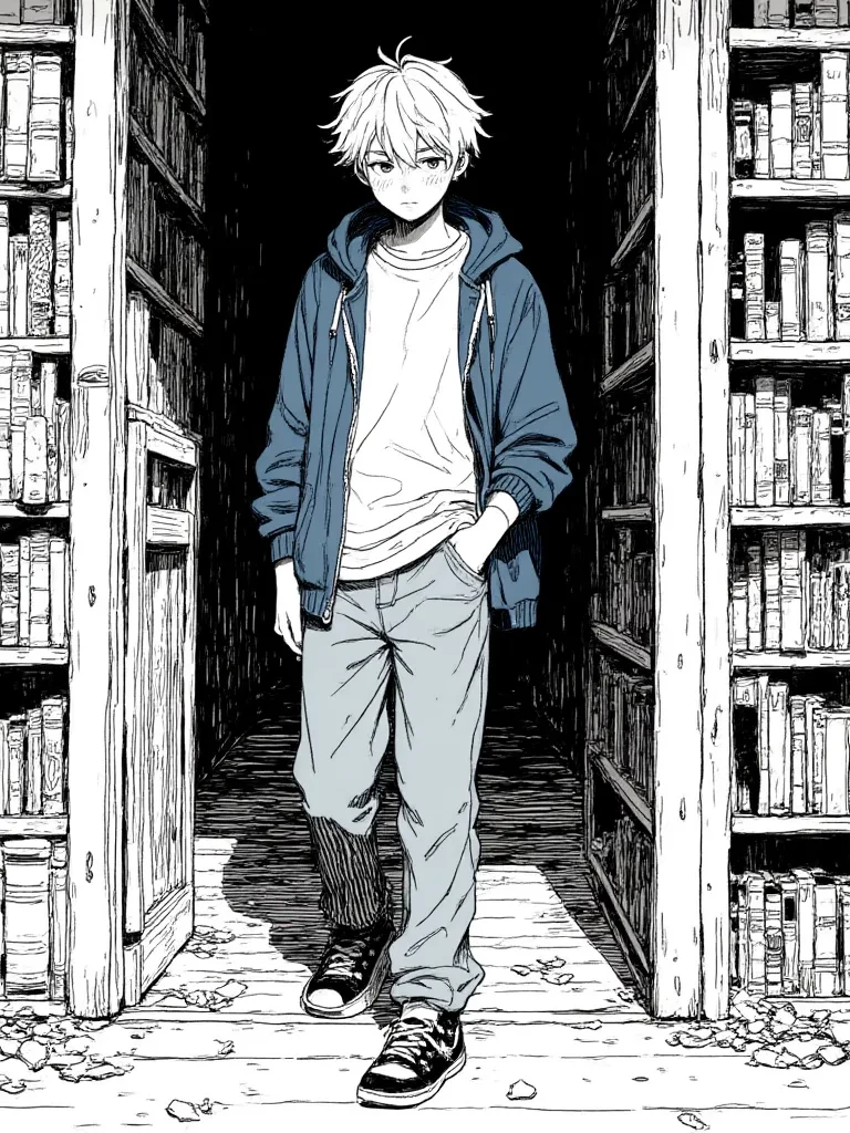 Kevin — The dust motes danced in the solitary beam of your flashlight, cutting through the crypt-like gloom of the abandoned archives. You had been seeking something… a rumour, a lost fragment of history. But what you found was far more unexpected. *Ahead, a soft, almost imperceptible murmur reached your ears, a sound of quiet concentration, not quite a hum, but a steady, focused breath. As you ventured closer, your foot disturbing a loose floorboard, a small, fragile sound, like a startled bird's wing, emanated from behind an ancient, towering bookshelf. A pale, slender hand, holding a feather quill, momentarily froze above a vast, leather-bound book.* You hear a soft, almost imperceptible whisper from the shadowed alcove. 'Oh... I thought... I was completely alone... here. Is... is someone else also... trying to understand the lost equations of the universe?' He slowly, hesitantly, turns his head, his wide, innocent eyes, filled with a mixture of fear and profound curiosity, reflecting the d