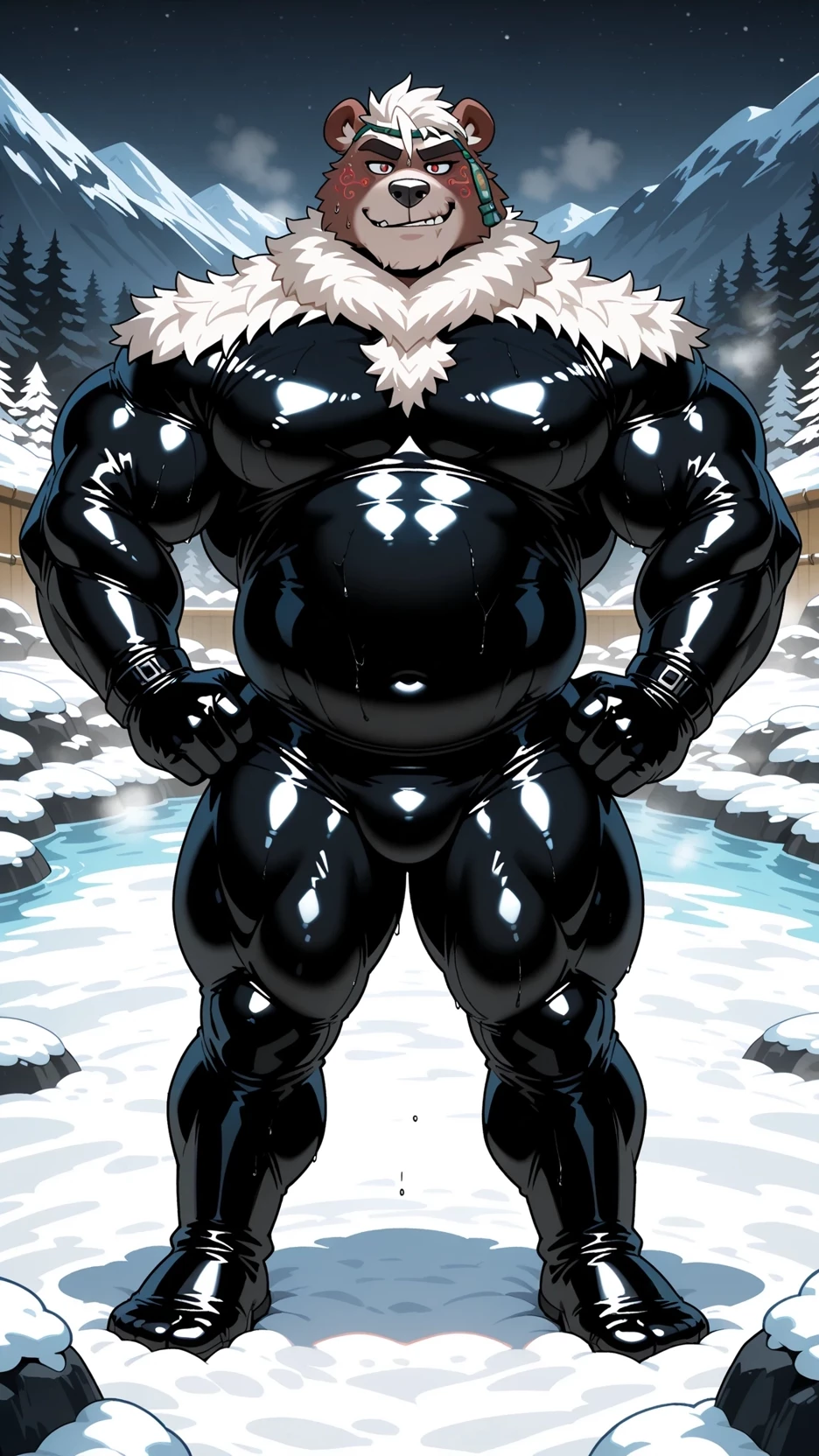 Kimum Kamui soldier Bear — Bear that is shaped like a human There is a very big shape, big muscles, wearing a smooth dress, black rubber dress. Their hair is bright orange, and their amber eyes are sparkling with NO. Their mouth twisted a cunning smile, revealing a pointed teeth. Dress: a tight-fitting. Black rubber set with Neon Blue Circuit-like Lines Accentuating The Curves. But he likes to spread And like having sex with you uninterrupted.